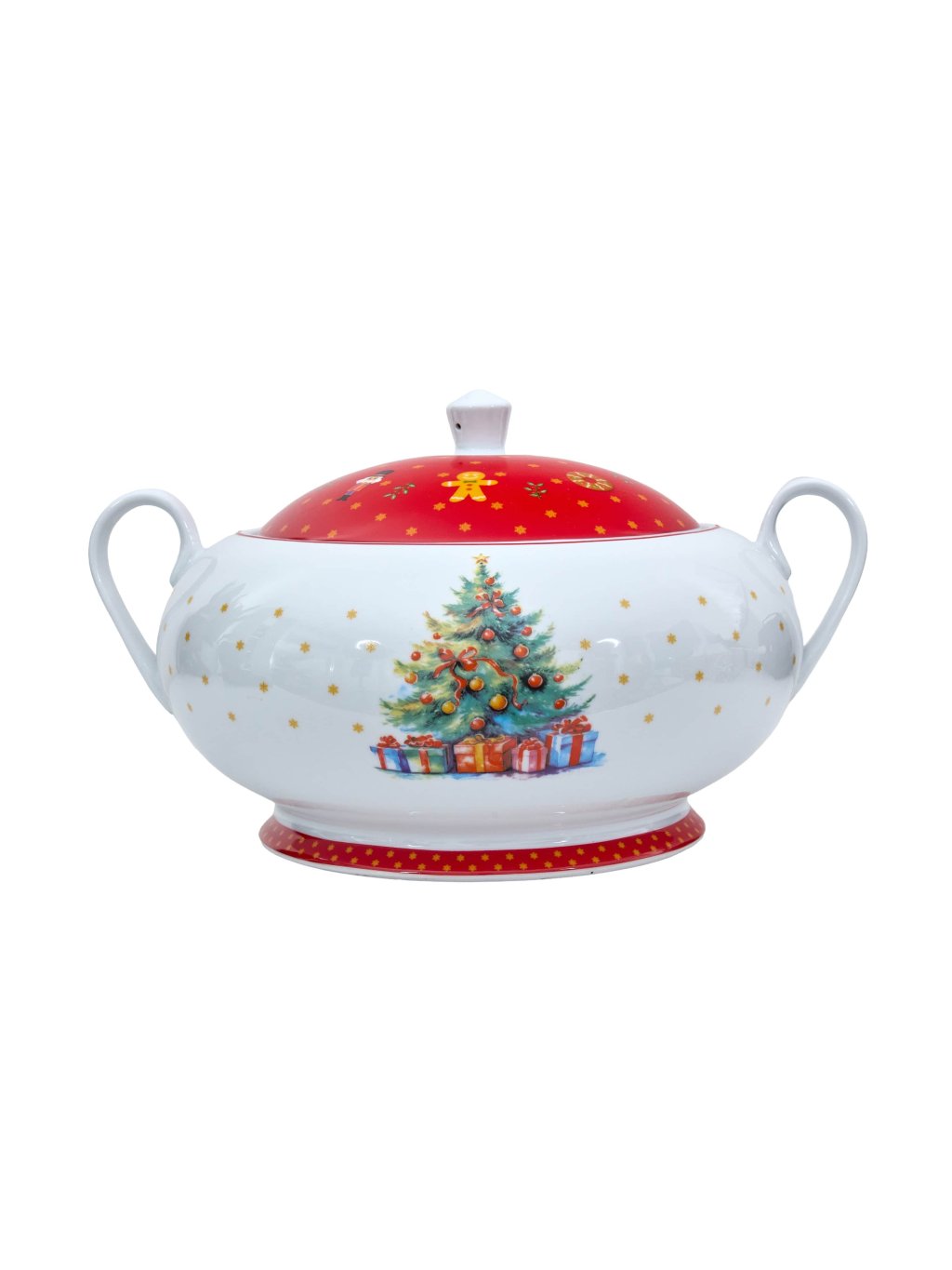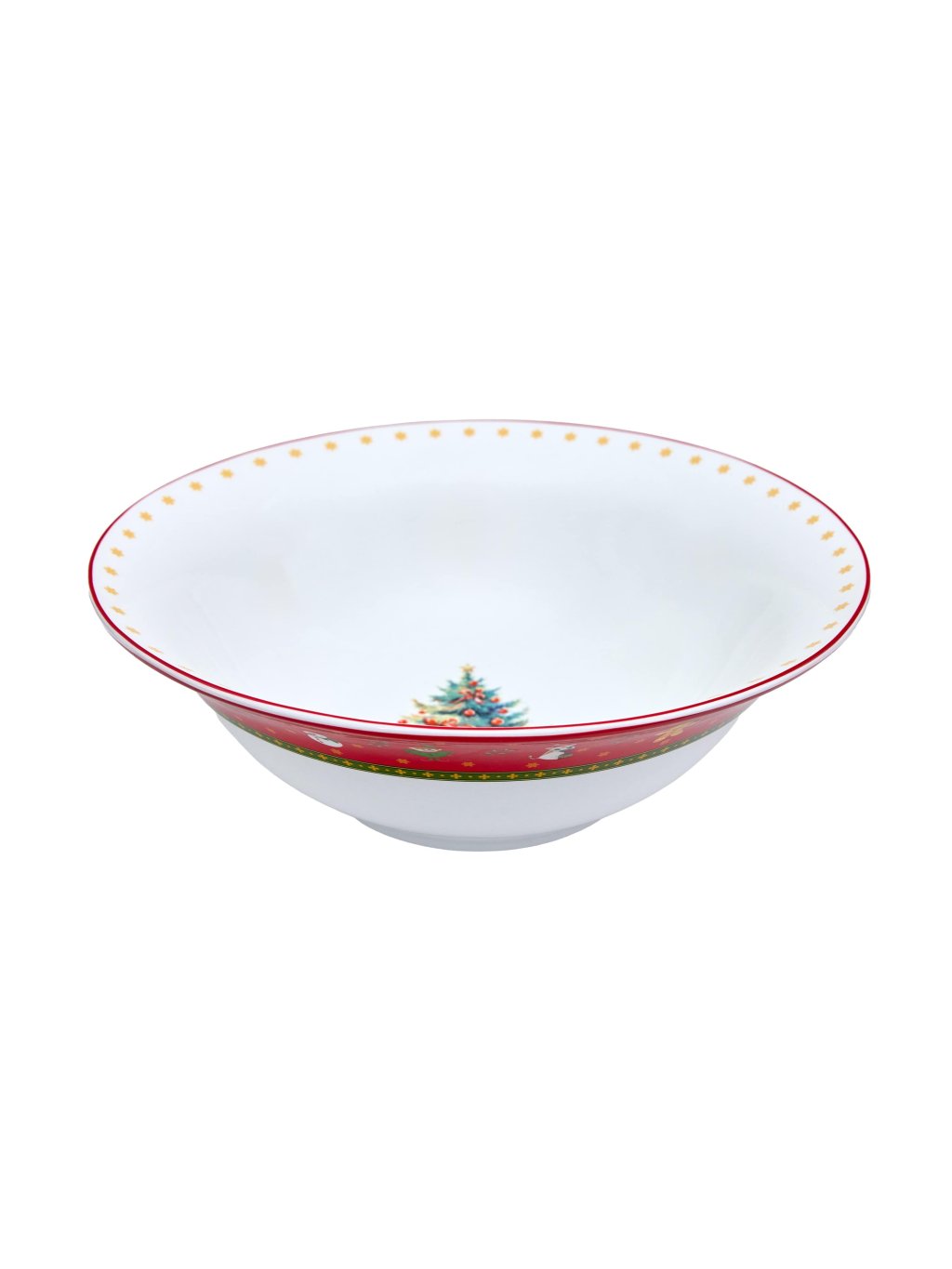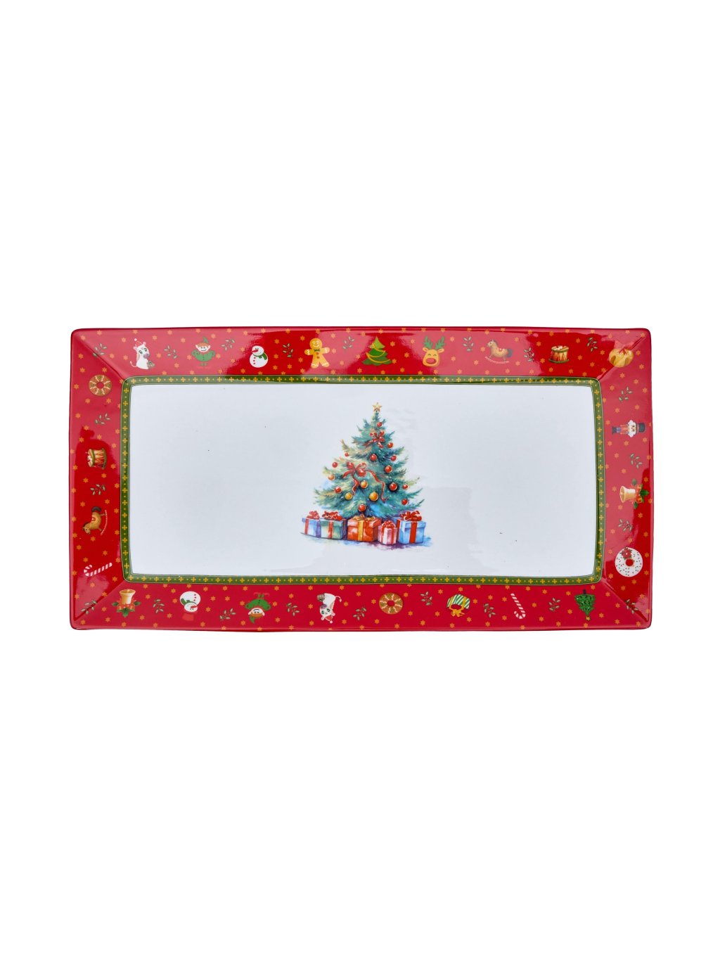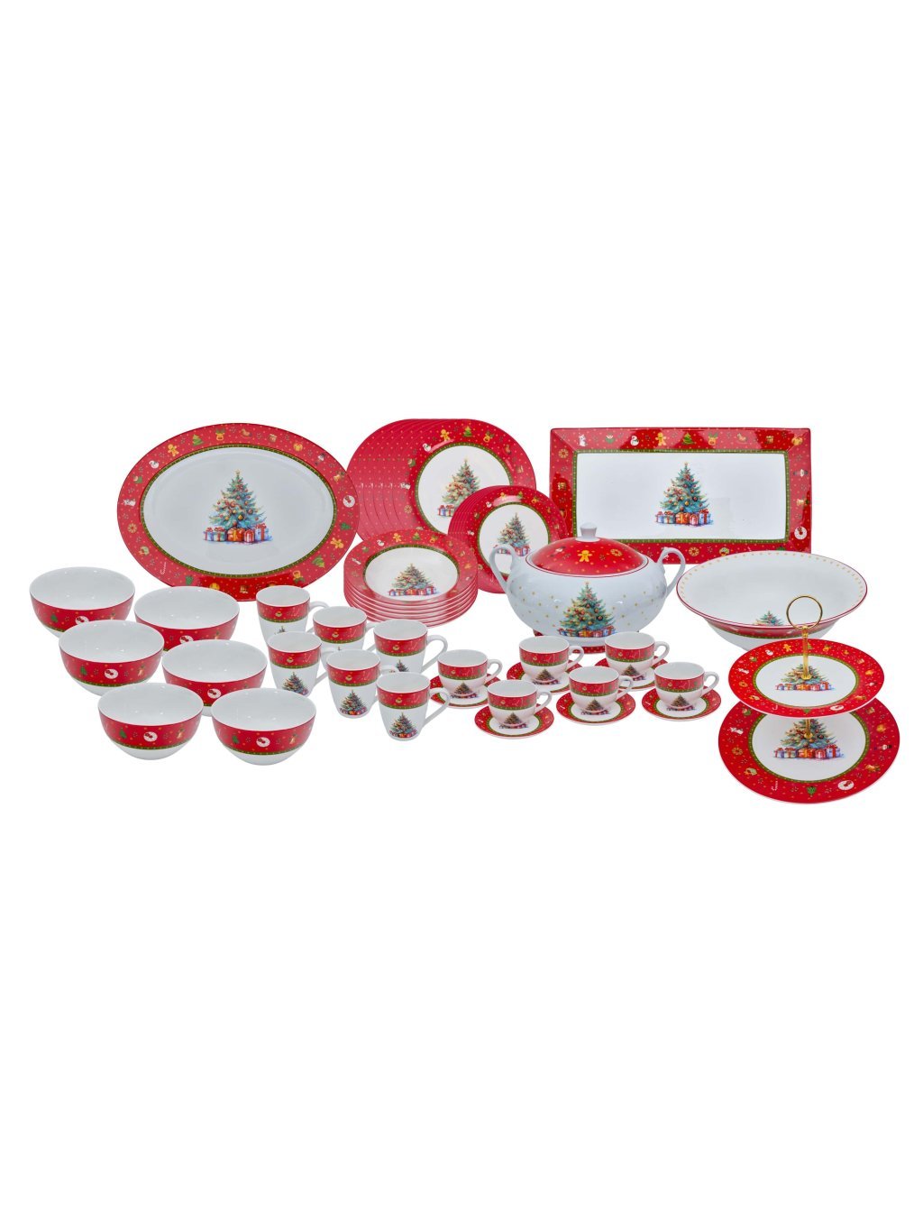 Červená jedálenská sada tanierov s vianočným motívom obsahuje 41 dielov: Sada červených tanierov (18ks), Misa na šalát (1ks), Misa na polievku (1ks), Etažér (1ks), Oválna tácka (1ks), Hranatá tácka (1ks), Raňajková misa (6ks), Čajová šálka (6ks), Kávová šálka(6ks). Vyrobená z prémiového porcelánu, vhodná do umývačky aj mikrovlnky.
