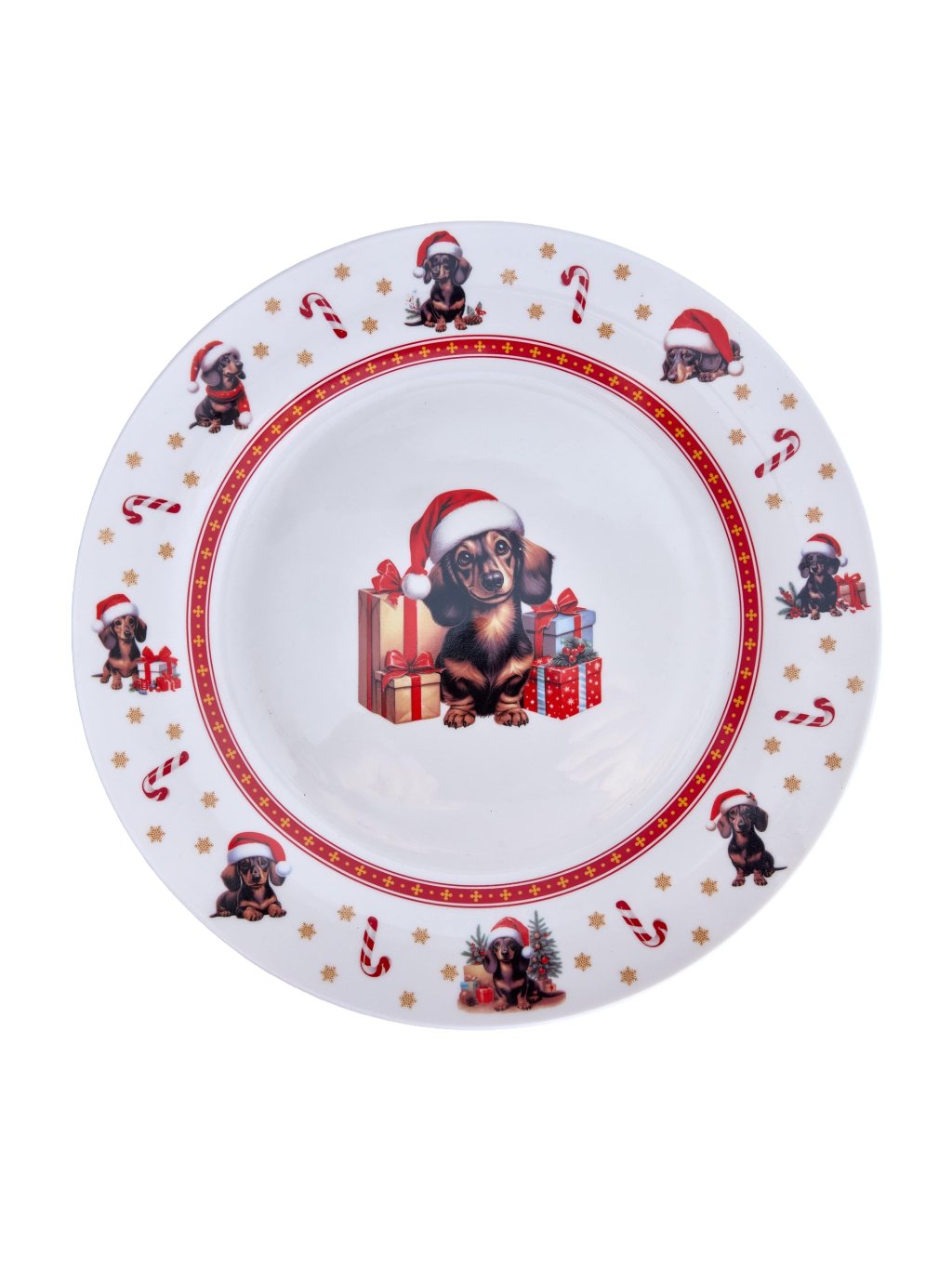 Vianočný dezertný tanier – Jazvečík. Štýlový vianočný dezertný tanier z prémiového porcelánu s priemerom 20,3 cm. Tento Jazvečíkovský vianočný tanier je praktický, elegantný a vhodný do umývačky riadu aj mikrovlnky.