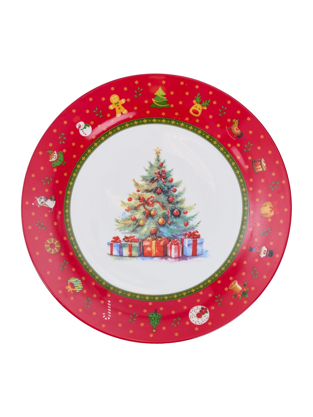Vianočný plytký tanier – Červený. Elegantný vianočný plytký tanier z prémiového porcelánu s priemerom 27 cm. Tento červený plytký tanier je vhodný do umývačky riadu aj mikrovlnky.